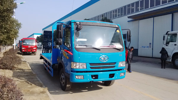 解放叉車運輸車主要是在解放平板運輸車的基礎上對尾部爬梯部分經過了改裝,加寬及加長了爬梯部分,使3噸左右的小型叉車也可以輕松通過這輛解放叉車運輸車來運輸。