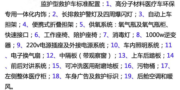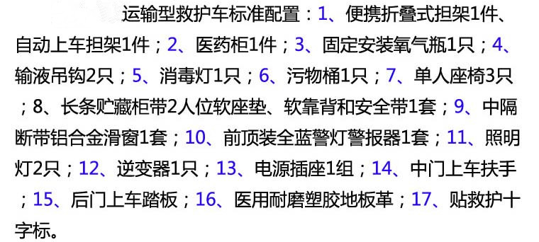 | 其它 | 1.車內(nèi)裝置藥柜、擔(dān)架、氧氣瓶、輸液掛鉤等專用裝置;2.隨底盤選裝中頂時(shí)整車高度為2490mm;隨底盤選裝高頂時(shí)整車高度為2875mm;3.ABS系統(tǒng)控制器型號:APG3550500G;ABS系統(tǒng)控制器生產(chǎn)企業(yè):浙江亞太機(jī)電股份有限公司;發(fā)動(dòng)機(jī)最大凈功率83KW;4.隨底盤選裝后踏步板,對應(yīng)整車長度為5696mm,不選裝后踏步板時(shí)對應(yīng)整車長度為5496mm;隨底盤選裝輪罩蓋,選裝前霧燈,選裝黑色前大燈;6.車身可選裝爆閃燈.車頂可選裝圓柱形爆閃燈. | ||