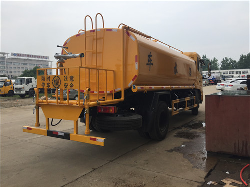 上裝配置:罐體有效容積12立方,采用5毫米厚武鋼碳板板自動焊接制作,配品牌大功率灑水泵,帶前噴后灑側噴,尾部平臺帶高位水炮,可自吸自排。前沖14米寬,水炮射程28米,自吸深度7米。