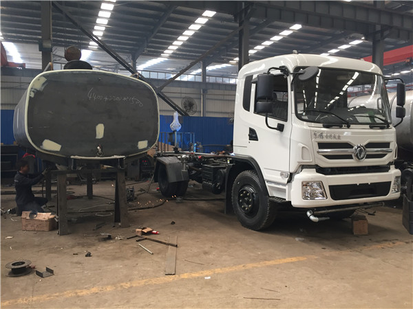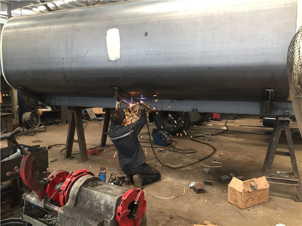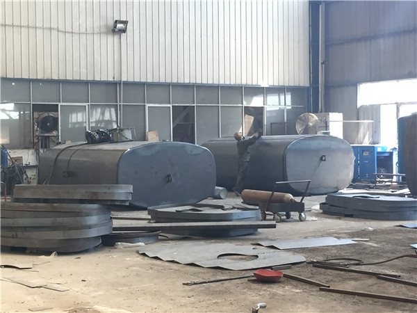 工人們把灑水車罐體和灑水車罐蓋進(jìn)行對接,吊車將灑水車罐體底座運(yùn)往罐體上方,工人正在焊接灑水車罐體底座,已焊接完成的碳鋼罐體