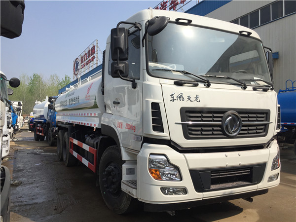 東風天龍18噸灑水車底盤配置(底盤型號:DFL1250A8):6*4驅動(后雙橋),配備美觀大氣的東風天龍平頭單排液壓翻轉式駕駛室,康明斯245馬力、直列六缸、增壓中冷柴油發動機,7噸前橋,雙10噸后橋,載重能力更大;電阻加熱冷啟動裝置,全鋼350L燃油箱,機械油門踏板,動力轉向,6檔變速箱,11.00-20尼龍胎,排氣制動,帶空調;綜合燃料消耗量29.2L/100km,50km/h空載等速燃料消耗量18.9L/100km。