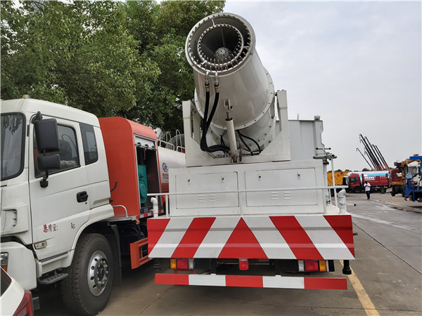 上裝標配;罐體容積12立方,罐體為方形,內部做防腐,加裝4個進口氣動閥(駕駛室內操作),主管路鍍鋅,工作平臺,采用億豐60/90大流量水泵,消防接口可自流,音樂喇叭,60米噴霧機組(CLW-100型),副發動機為75KW,萬科7.5KW不銹鋼多級離心泵,22KW風扇電機,選裝無線遙控操作,意大利陶瓷中央噴頭,霧化距離:60米(室內靜風狀態),實際射程:100米(溫度、濕度、風速等標準狀態