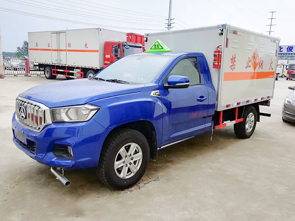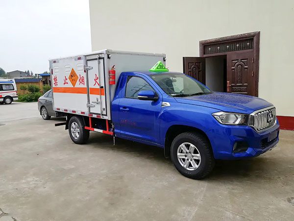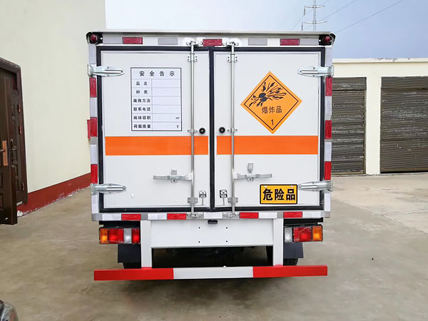 廂體全金屬整體骨架結(jié)構(gòu),外飾冷軋鋼板(隔熱,防靜電),內(nèi)飾鋁板(隔熱,防靜電),中間骨架結(jié)構(gòu)(提高廂體強(qiáng)度),所有箱板內(nèi)部填筑阻燃高強(qiáng)度泡沫板整體高壓粘合鉚接后焊接拼裝成廂型,底板鐵板上鋪設(shè)防靜電膠皮(絕緣,導(dǎo)靜電),前臉底部鋁板上加裝靜電防撞膠皮,內(nèi)飾臥環(huán)(固定貨物定位拉環(huán)),透氣孔,外部帶通風(fēng)孔,保持廂體與外部空氣流通,及時(shí)與外部空氣交換,確保安全,大梁加裝拖地靜電膠帶,把貨物摩擦靜電導(dǎo)入大地。車輛門框配備防盜報(bào)警器,廂內(nèi)頂部安裝煙霧報(bào)警器,前廂板左右立柱安放滅火器,排氣管前置安裝排氣火花熄滅器,駕駛室安裝“危險(xiǎn)品”標(biāo)志燈,車廂外中部粘貼橙色反光帶一周,并在車廂左、右、后安裝“爆炸品”菱形牌3塊,車體后部設(shè)置安全告示牌、“危險(xiǎn)品”黃色警示牌,后保險(xiǎn)杠安裝緩沖加強(qiáng)橡膠塊等。車廂開側(cè)門,方便裝卸貨物;可加開隔倉(cāng),方便不同性質(zhì)的爆破物品同車分倉(cāng)運(yùn)輸。