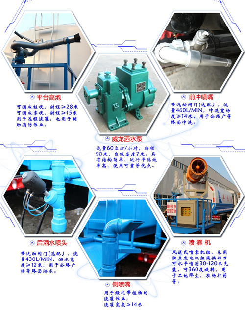 抑塵車(chē)主要的作用是各種環(huán)境下的灑水、噴霧、除塵、降溫等,運(yùn)用在路面養(yǎng)護(hù),道路清潔,園林噴灑,抗旱救災(zāi),抑塵除霾,運(yùn)輸飲用水等;適用于沖洗路面保持道路濕潤(rùn)降低灰塵漫天,抑塵車(chē)還可以給綠化帶澆花澆樹(shù),抑塵車(chē)還可以在工地、廠區(qū)、煤場(chǎng)等路況降塵灑水,更可以作為緊急消防水車(chē)。下面程力專(zhuān)汽生產(chǎn)的抑塵車(chē)為例來(lái)介紹下其各組成部分的功能如下:
