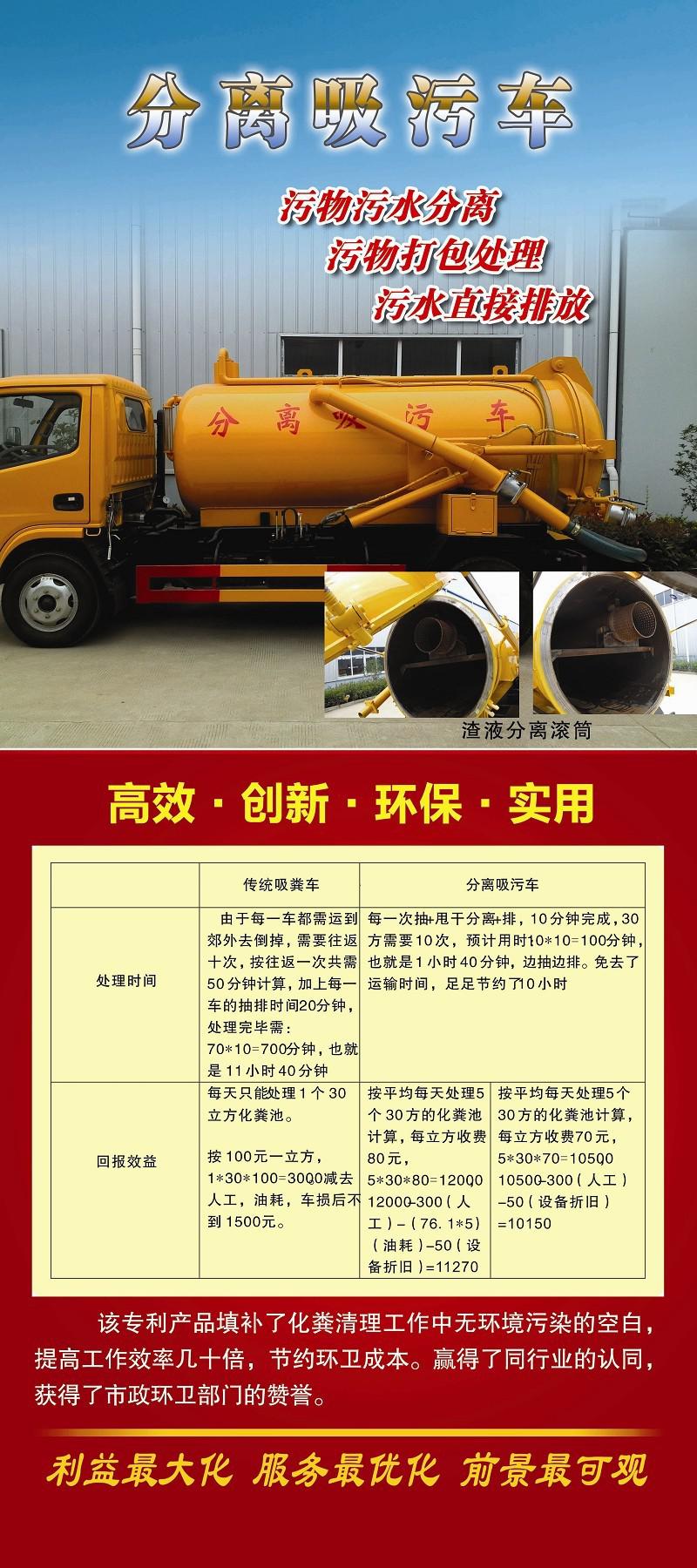 分離式吸污車采用國內(nèi)技術(shù)領(lǐng)先的吸污專用泵,吸力大,吸程遠(yuǎn),特別適合用于下水道內(nèi)的淤積物的抽吸、裝運(yùn)和排卸,尤 其是可吸下水道泥漿、淤泥、石子、磚塊等較大物體、含水量較小等物質(zhì)。抽滿污(糞)罐體時(shí)間:≤5min,吸程:≥10m。自吸自排,壽命長,工作速度快 ,運(yùn)輸方便。